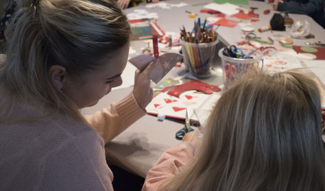Vi sørger for et bord, der bugner af materialer - så børnene kan pynte et af vores mange juletræer, så det kommer til at stråle! Der kan klippe-klistres nisser, engle og stjerner og pyntes med farver og klistermærker!